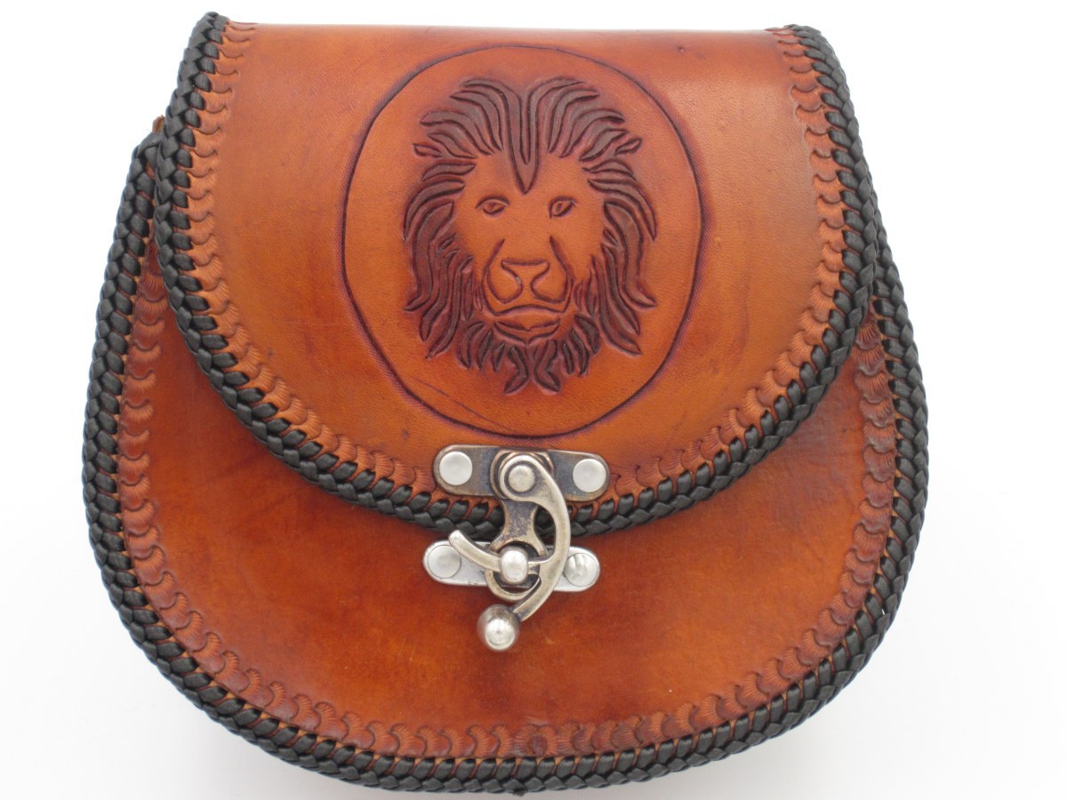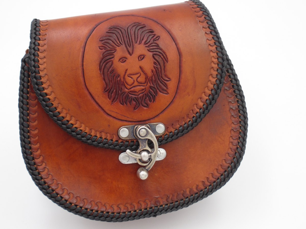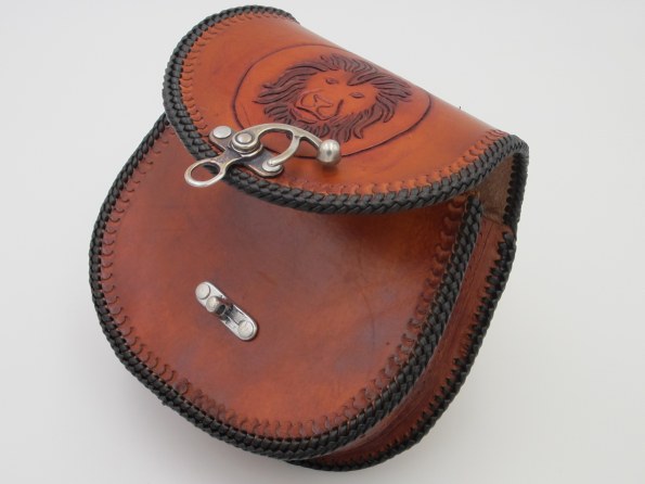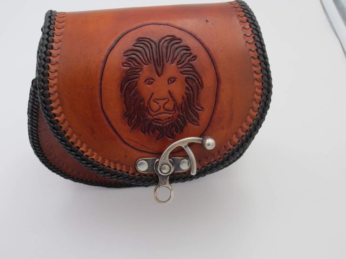 Wie man unschwer erkennen kann ziert diese Rundtasche mit Flechtrand (einen Double-Loop) ein stolzer Löwenkopf (Leu=Löwe).