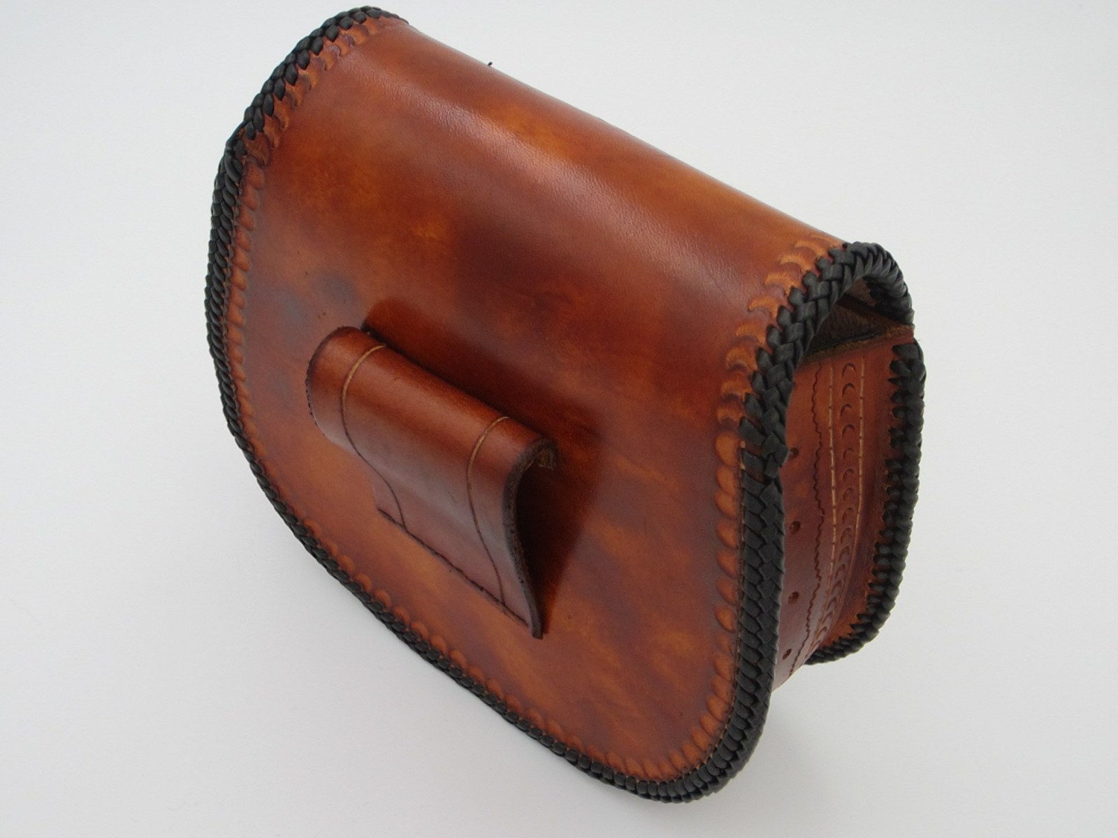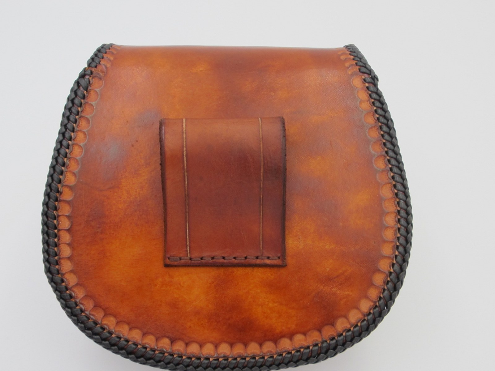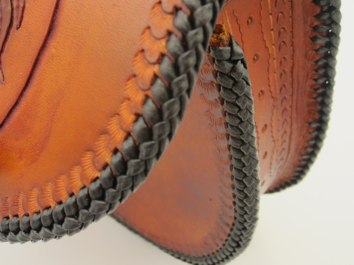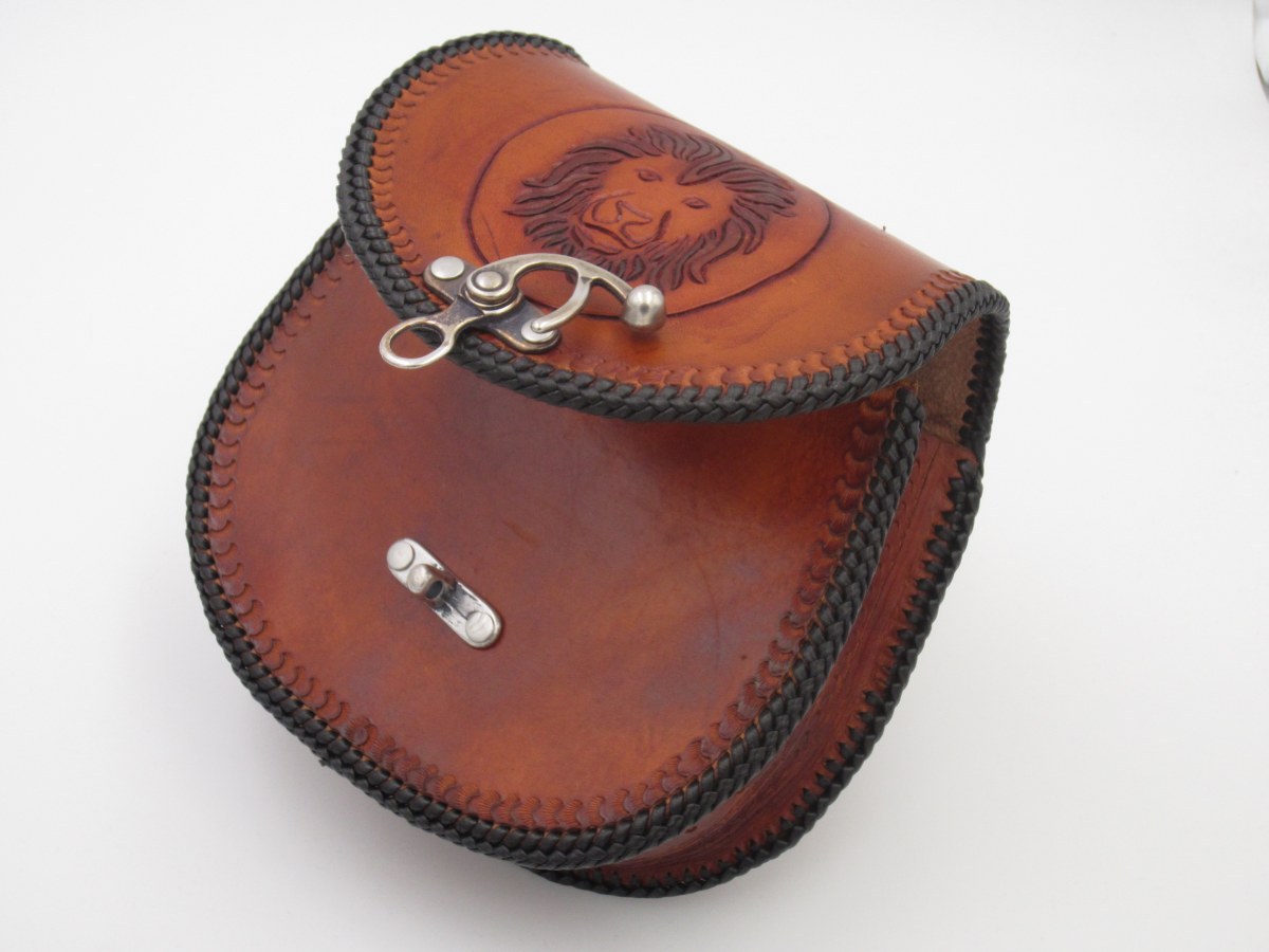 Wie man unschwer erkennen kann ziert diese Rundtasche mit Flechtrand (einen Double-Loop) ein stolzer Löwenkopf (Leu=Löwe).